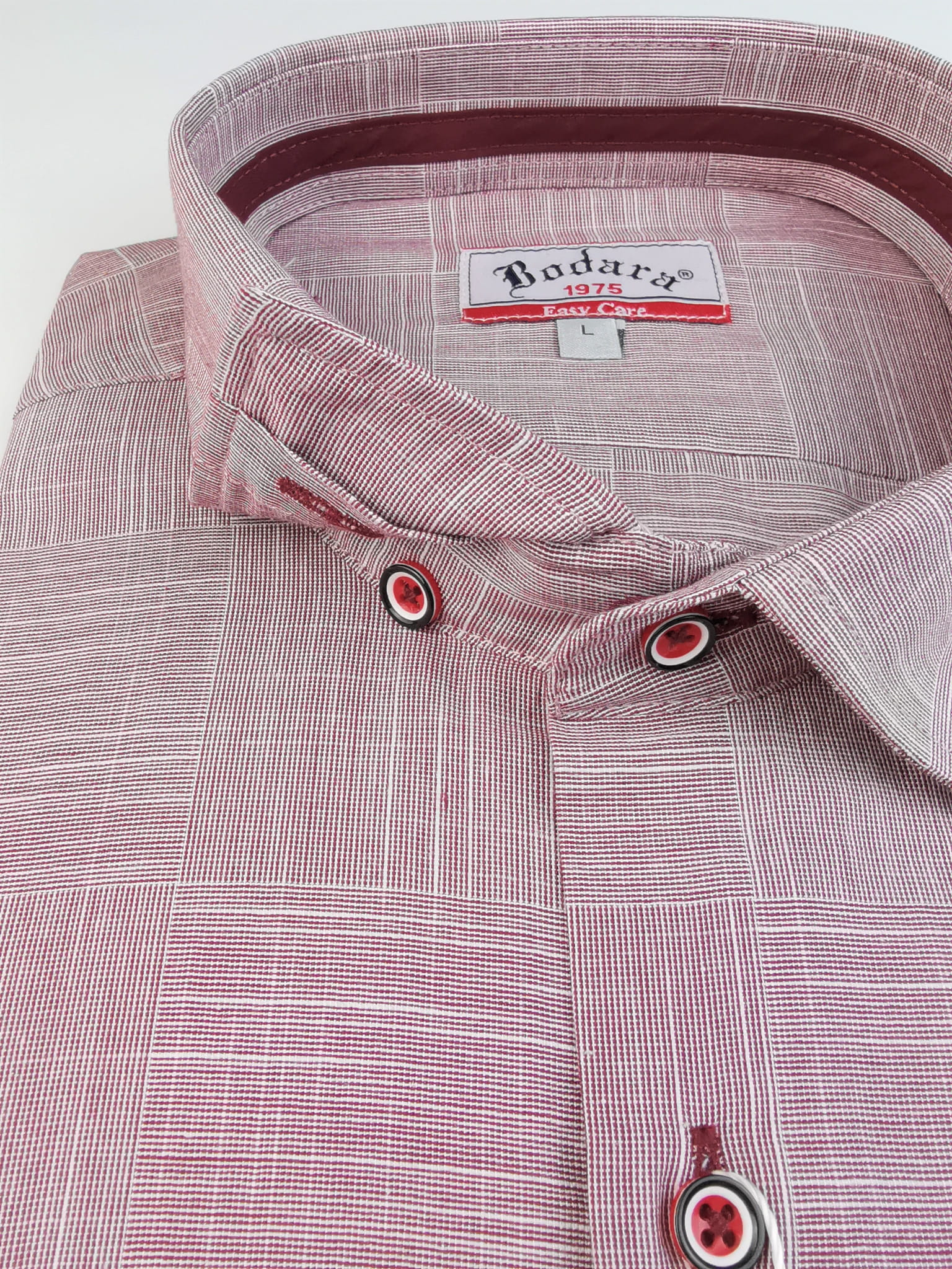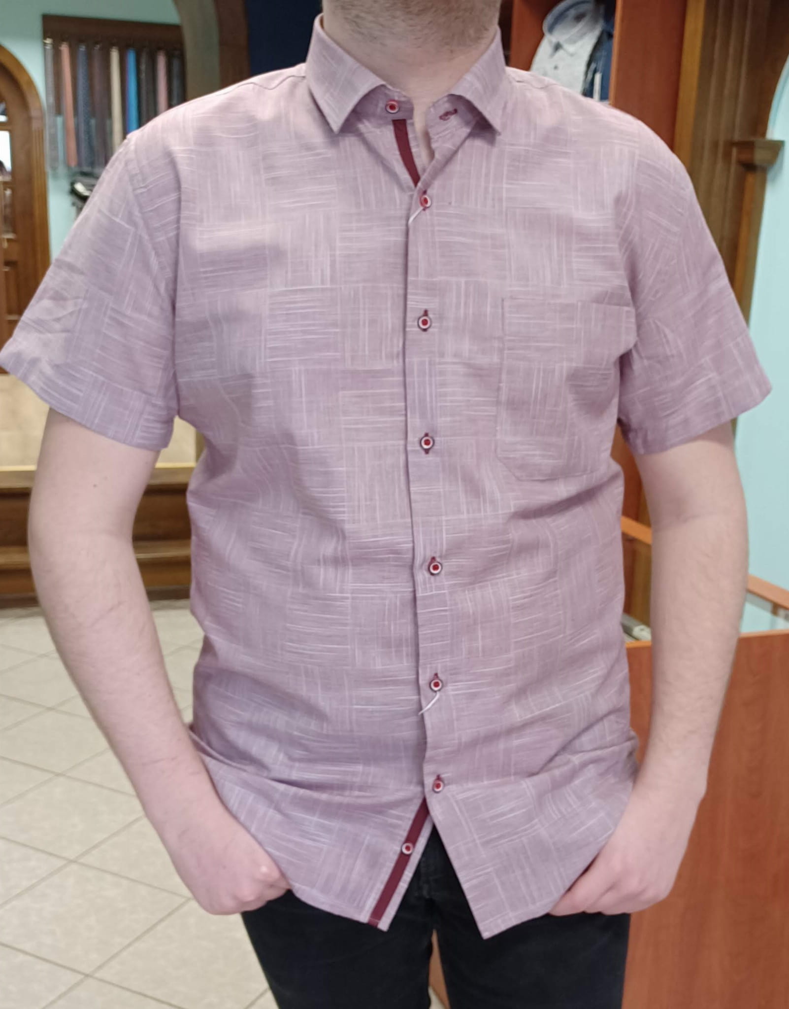 Ekologiczna, naturalna koszula męska z krótkim rękawem o kroju SLIM-Fit. Tkanina bawełniana o właściwościach lnu. Wizytowa koszula męska ciemno-różowa a'la lniana z fakturą melanżu z ozdobnymi bordowymi lamówkami i ozdobnymi guzikami. Idealnie pasuje do pracy i na upalne dni.